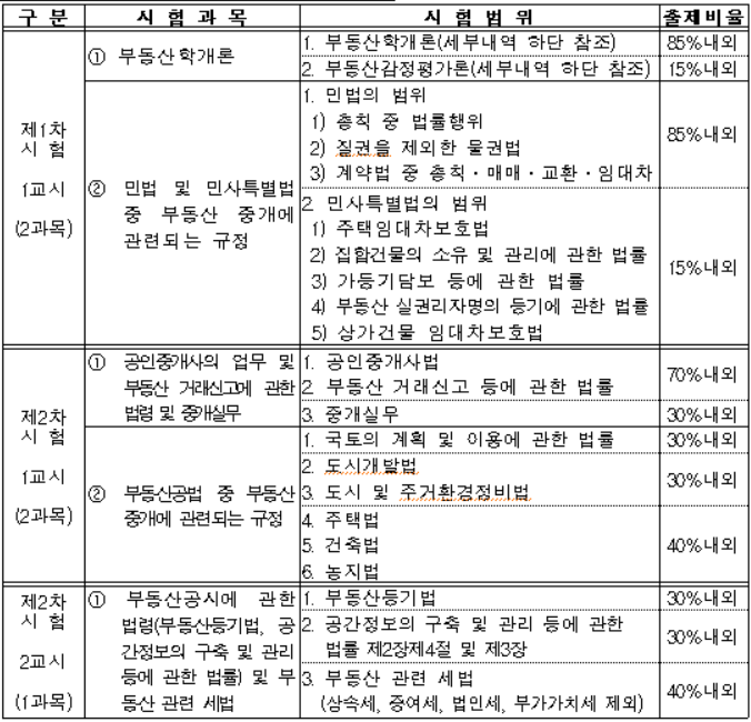 공인중개사 시험과목당 시험범위는 다음과 같습니다. 각 차지하는 출제 비율이 큰 쪽의 부분을 중점으로