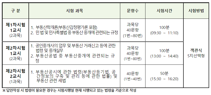 1교시 100분 동안 부동산학개론(40문항)과 민법 및 민사특별법 중 부동산 중개에 관련되는 규정(40문항)씩 총 2과목 80문항으로 5지선택형의 시험입니다. 한 번에 2과목을 100분 동안 보는 거랍니다. 시간 분배가 중요하겠죠.